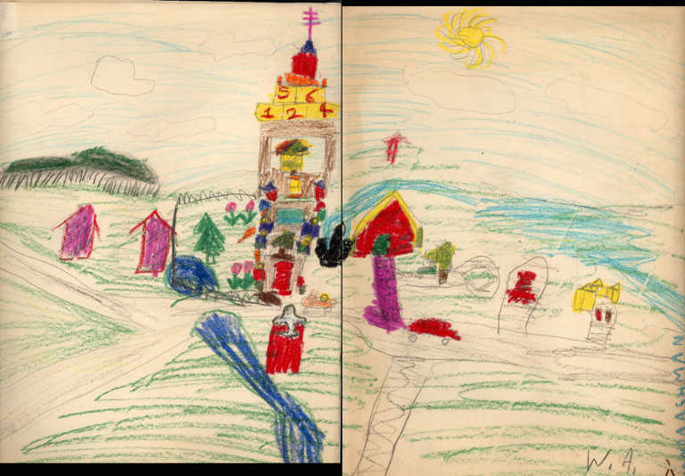 A town, based on a tower I made of building blocks (the thing in the center). mid-1950s. I had to scan this in two pieces but it is on one big sheet of paper.