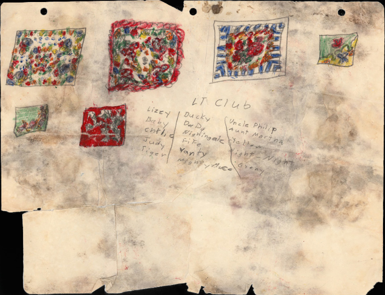 A drawing of my handkerchiefs and scarves which were buried with my "night-night" security scarf at its funeral. But I dug everything up a month or so later because one of my friend's teenage sister told me night-night was sad and sobbing. The "LT Club" lists dolls and people and scarves. I'm not sure what "LT" was for. Late 1950s.