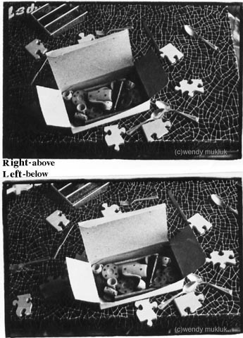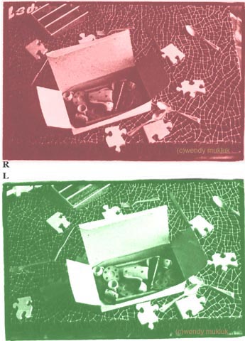 Here are some newer examples; still not great ones. The original left and right photographs were scanned and the colors added in Photoshop. The two colored images were superimposed in Photoshop, with the top layer at 50% opacity. You need to get the colors right and the images positioned correctly for it to work. You might need to move the images closer together or farther apart, and make the colors lighter or darker or closer in color to the glasses.