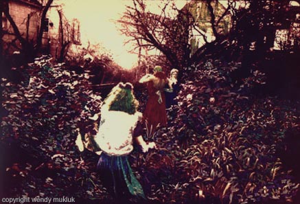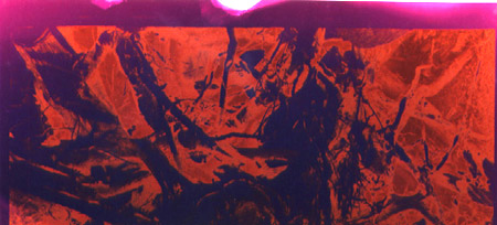 Draw on or color in areas of high contrast negatives with any marking pens whose ink sticks to the film. Water based ink might bead up, but you might like that effect. If you print the negative on direct color paper, you will get an image pretty much like the colored negative. If you print the negative on color reversal paper, as in this example, the colors are the opposite of what you drew. Also, try drawing on clear film, or scratch the emulsion on solid black film and then color the scratches, and then use the colored film for a negative and print on color paper. (or black and white paper, and get a gray tone image). |