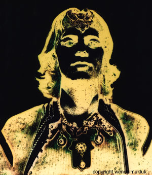 High contrast negative printed on Cibachrome, the wet surface then scratched, the yellow emulsion peeled off, and the whole thing then Xeroxed |