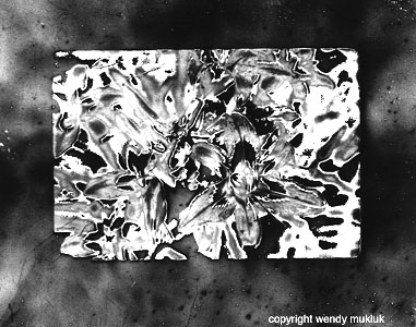 Patterns from dust and dirt. 35mm negative made from positiv/negative sandwich, from original 35mm slide. On small pieces of film, dust specks become magnified. The film was also somewhat fogged (partly from age and partly during processing), resulting in solarized background and dust images. (62k jpeg) |