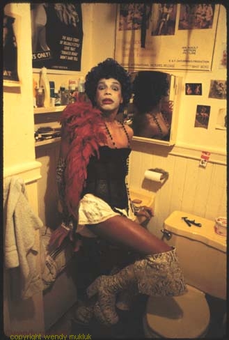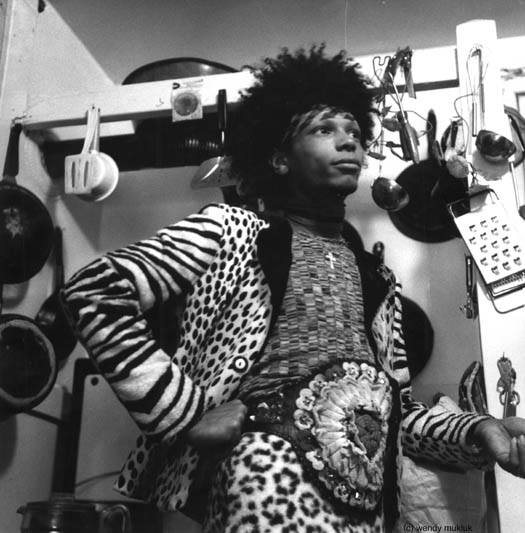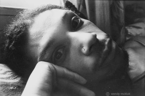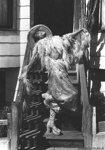 We really were twin sisters in a lot of ways. In the 1970s, especially when we lived together on Market St. and Montcalm St., we used to get dressed up in matching drag, or at least following the same general theme. Maybe we'd both wear black slips and black lipstick, or maybe cut off blue jean shorts with dashikis and all of our wooden spool necklaces, or maybe leotards and rubber boots (our "sex kittens from outer space" motif) or we'd both wear 60s "fish dresses" with wigs and spike heels. Luckily, being twin sisters, we could wear the same size clothes. We would get dressed up for no reason, just because. Reggie definitely had a flair for innovative fashion. He was also my favorite model, and some of my best pictures are of him. Reggie was excellent at making wisecracks and at injecting humor into everyday situations, and had a very jolly, guffawing sort of laugh that made me laugh, too. Part of the general Mukluk way of doing things is to make as much as possible in life into a joke, and Reggie was a true Mukluk. I usually don't do formal photo shoots, I just take pictures as they come, and Reggie would make everyday events like doing laundry or grocery shopping into the best, most hilarious fashion shoots ever. Being twin sisters, Reggie and I had a lot of the same boyfriends, too, some of them at the same times. (We just both had good taste.) We weren't competing at all, and it was wonderful fun to giggle and swoon about a current heartthrob together. On days we didn't feel like doing much, we used to lounge around in our bathrobes on the couches in the living room and discuss and analyze our current flames in great detail, and we'd go on to discuss relationships, emotions, people, the world, and the universe in general. Reggie had a childlike sense of wonder that never left him. He related well with children and animals, I think in part because he still had a sense of innocence and could see things through their eyes, and in part because he was very accepting and treated everyone, including animals, like a deserving person. It was so funny to watch him talk to cats; they'd lean forward with a keen interest that they didn't seem to show other people. In the 1980s, after several good friends and boyfriends of ours died of AIDS, we both said how we hated how things turned out; so many hopes and dreams we had in the 1970s were dashed. But even after Reggie himself was diagnosed with AIDS, we both agreed that since we're here, we might as well have a good time. We both suffered from depression and could easily fall into the mire again, but Reggie said we might as well try to make the world a better place, and try to be happy. Over all, Reggie did manage to make the best of quite a few dismal situations. And now the world for the rest of us is much more sad and dreary, without Reggie's laughter and jokes. I still believe I should continue on in our Mukluk Twin Sister tradition of finding flamboyant fun where we can, although now it will be harder. June 2001 |